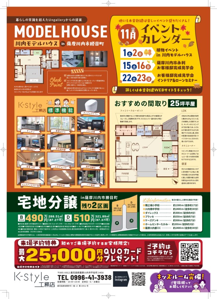 - 薩摩川内市勝目町の「29.10坪・3LDK+畳コーナーの快適プラン」モデルハウスを見学可能